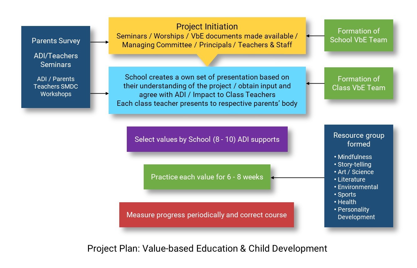 Following an initial presentation to a school from ADI and acceptance of the project by the school through a non-legal Memorandum of Understanding, a school VbE team is created consisting of some selected teachers and parents. A series of workshops, discussion sessions, parent surveys etc. are conducted until the school is ready to select a set of 10 Values that they would like to practice during the project. Each Value is practiced for two (2) months through a pre-determined process in agreement with the teachers.