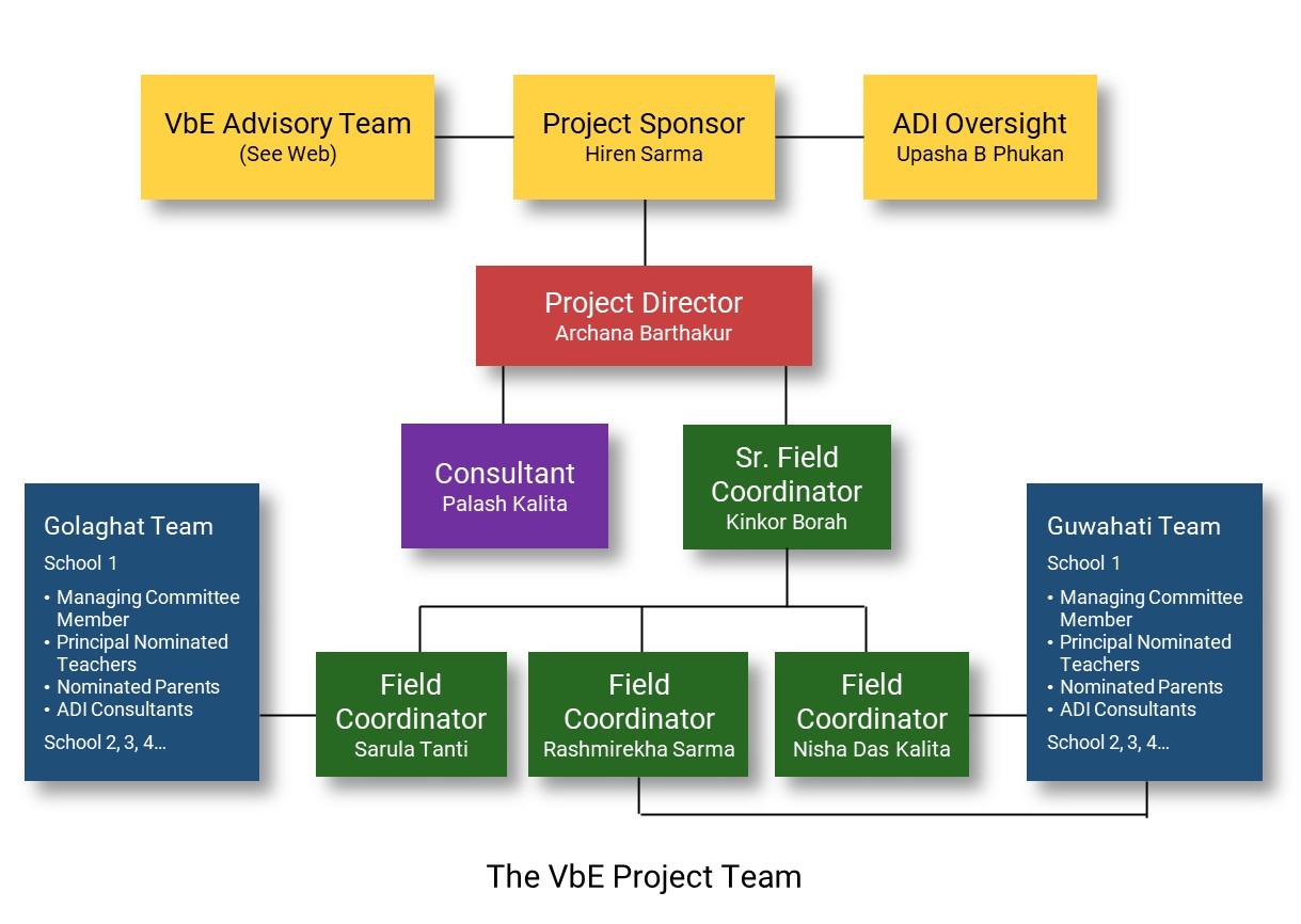The project is handled by the Project Director Archana Barthakur, (Guwahati, since inception), a Consultant Palash Kalita and the Senior Field Coordinator Kinkar Borah (Guwahati). Sarula Tanti (Field Coordinator, Golaghat) provides support at the schools in the Golaghat district on a day-to-day basis. Two additional Field Coordinators, Nisha Das Kalita and Rashmirekha Sarma have recently joined as Field Coordinators for Guwahati area to support the increasing work.